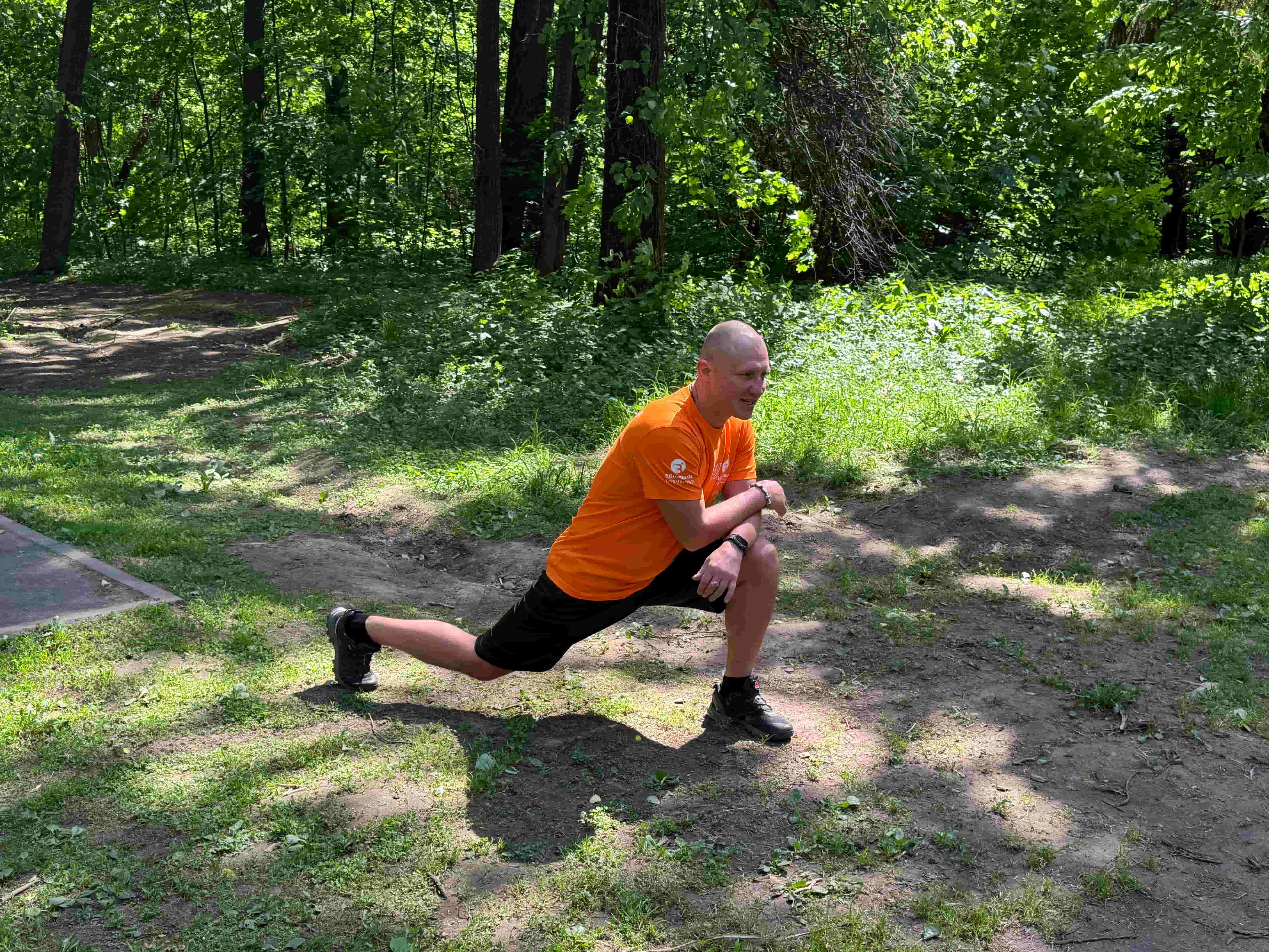 Зарядка прошла на свежем воздухе в парке усадьбы Пехра-Яковлевское. Роман показывал упражнения для разных групп мышц: бег на месте с поднятыми коленями, повороты головы, наклоны туловища, отжимания, а в завершение провёл небольшой спарринг.