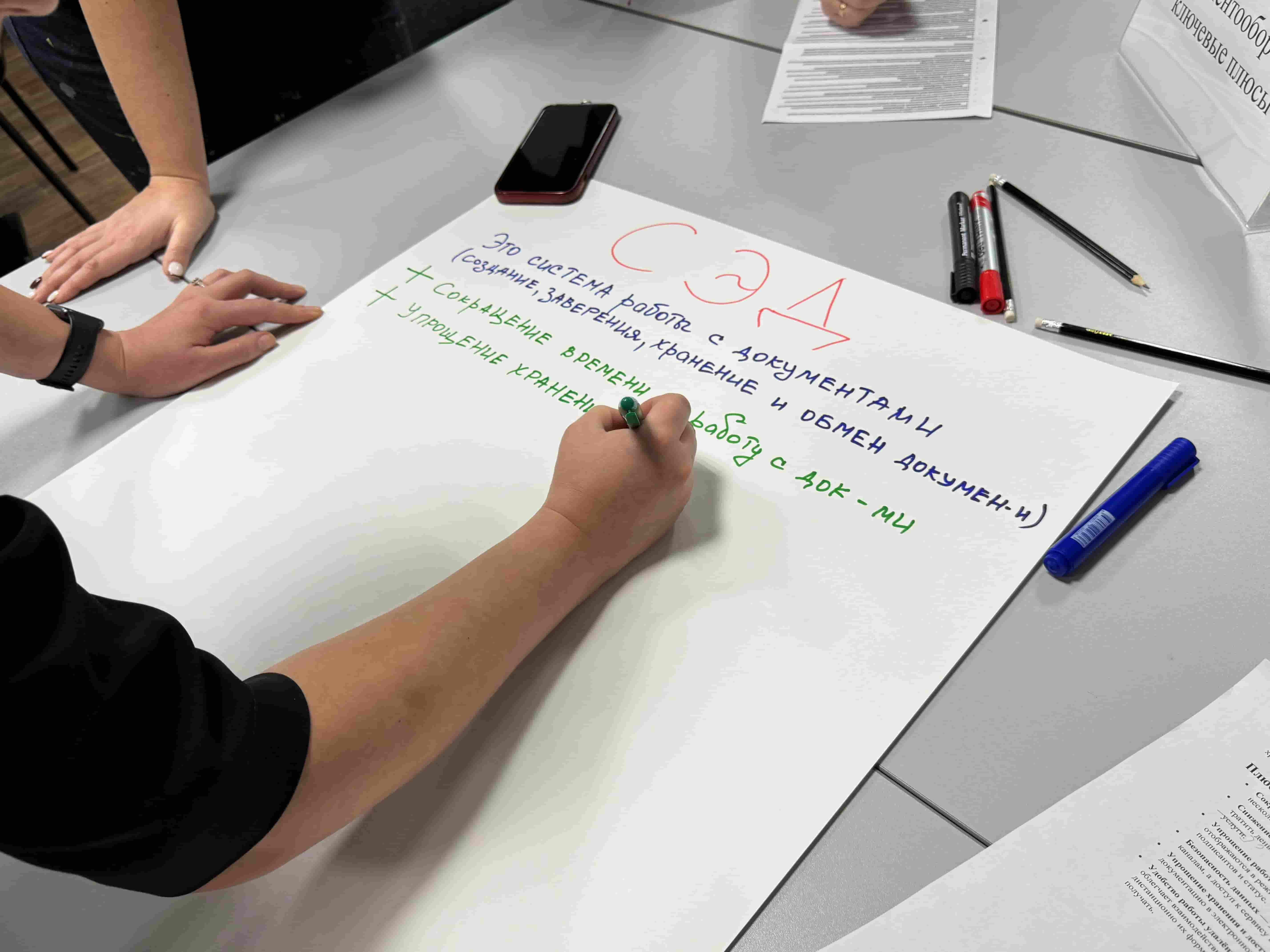 Завершающим этапом обучения стала проектная сессия «Проектирование новых форм документационного и информационного обеспечения деятельности университета», в ходе которой участники представили собственные идеи по совершенствованию документационного и информационного обеспечения университета. Команды работали по ключевым направлениям: создание цифрового помощника для абитуриентов, развитие информационной политики, укрепление корпоративной культуры, запуск студенческого МФЦ и оптимизация электронных систем документооборота.
