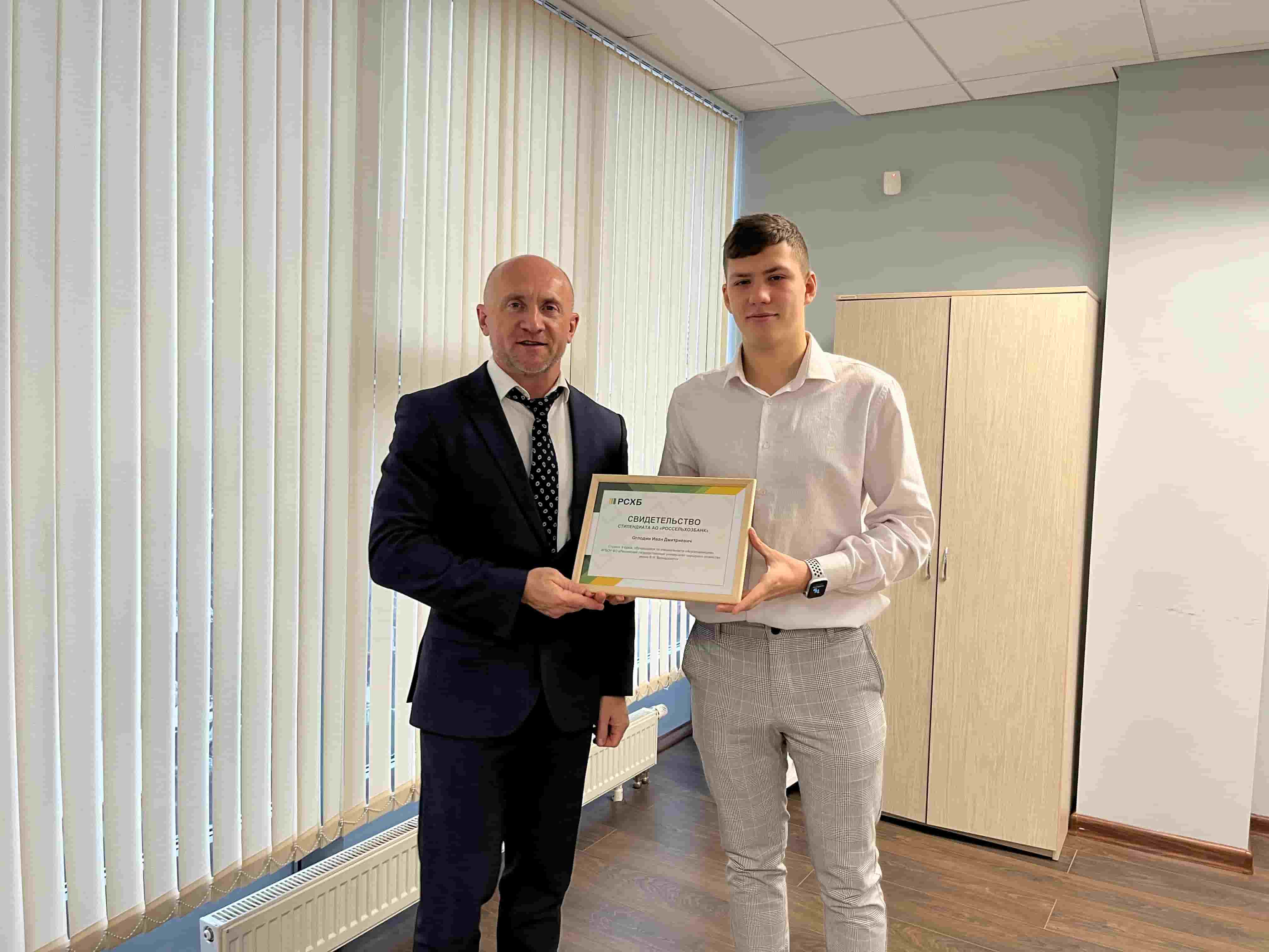 Стипендиальные свидетельства вручали директор регионального филиала Россельхозбанка по направлению «Центр розничного и малого бизнеса» Владимир Капранов и начальник отдела по работе с персоналом Елена Баэрт.